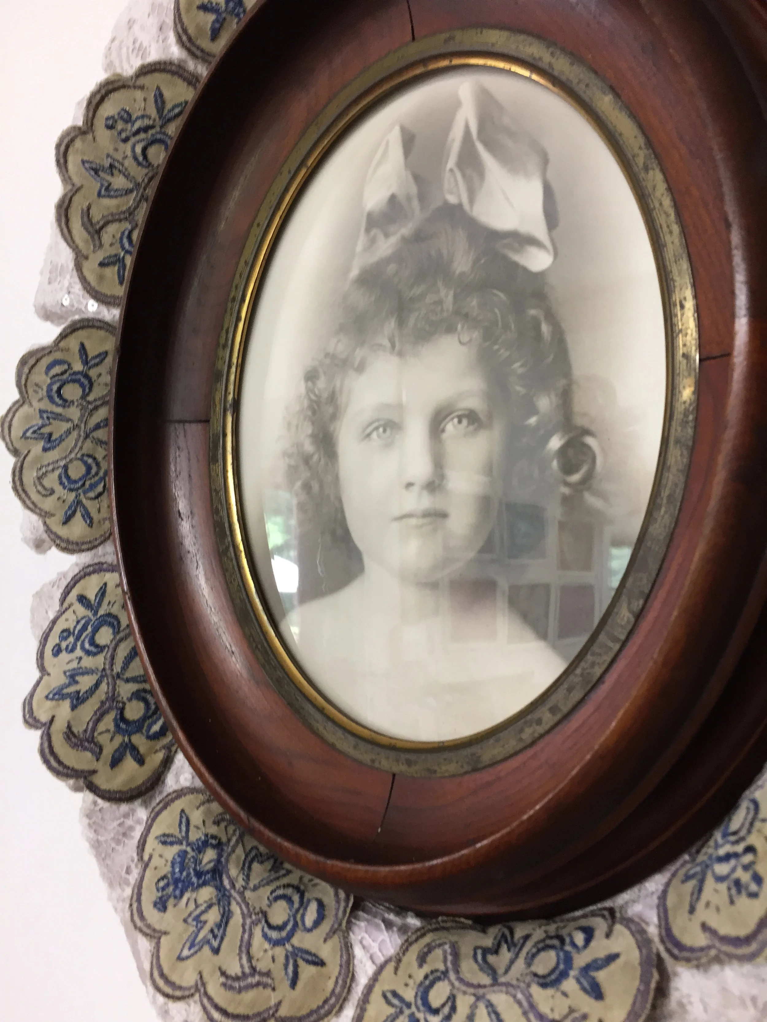 mixed media wall relief: Styrofoam, wood, fabric, metal, found photographs, plastic, 48” X 51” X 5 1/2"